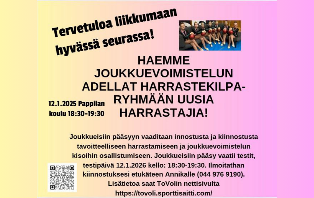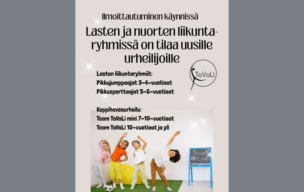 Lasten ja nuorten liikuntaryhmissä on tilaa uusille urheilijoille! Lisätietoa ryhmistä löytyy ryhmien omilta sivuilta: - pikkujumppaajat - pikkusporttaajat - keppihevosurheilun ryhmät Ilmoittautuminen…