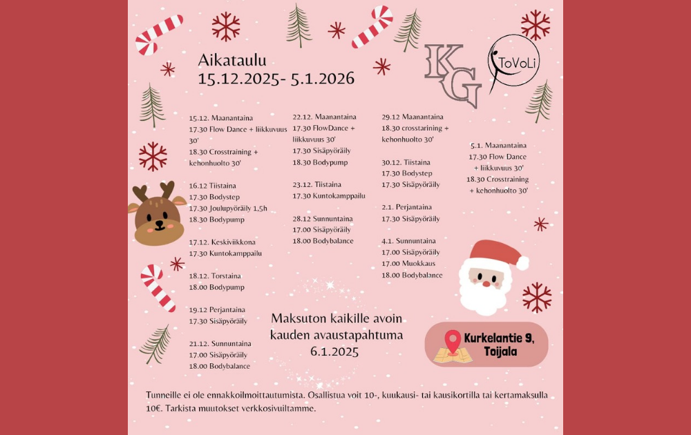 Tervetuloa ihastelemaan ToVoLin joulunäytöstä. Näytöksessä esiintyy kaikki lasten voimistelu- ja liikuntaryhmät. Näytös järjestetään tiistaina 9.12. kello 18.00 Toijalan Monitoimihallilla (osoite…